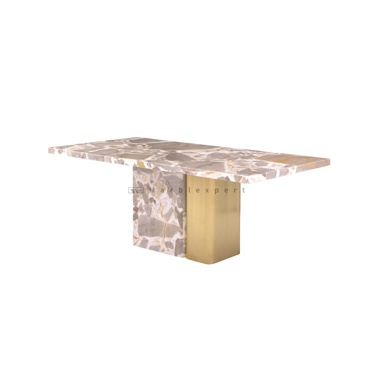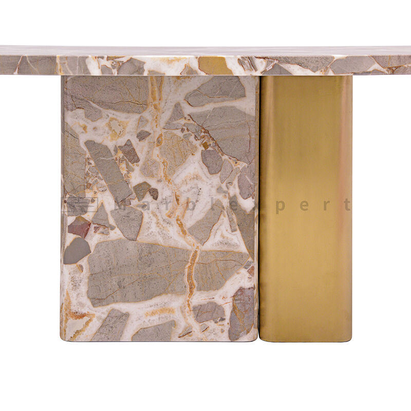 In the world of interior design, the dining table stands as the undisputed centerpiece of a home—a stage for nourishment, conversation, and memory-making. It is here that a truly exceptional table can transform everyday meals into curated experiences. Presenting our Stainless Steel and Marble Dining Table, a piece that embodies a sophisticated design philosophy through a masterful synthesis of elemental materials. This is not merely a piece of dining room furniture; it is a declaration of refined taste, designed to become the foundational element of a sophisticated and welcoming home. Its presence commands attention through a powerful trinity of textures: the enduring beauty of a natural stone table top, the warm revelation of a wooden underside, and the contemporary gleam of a polished base with sophisticated brush-gold accents. This dining table offers a perfect blend of organic grandeur and metropolitan elegance, creating a focal point that is both stable and stunningly light.