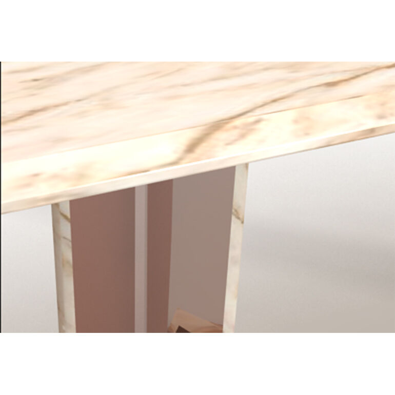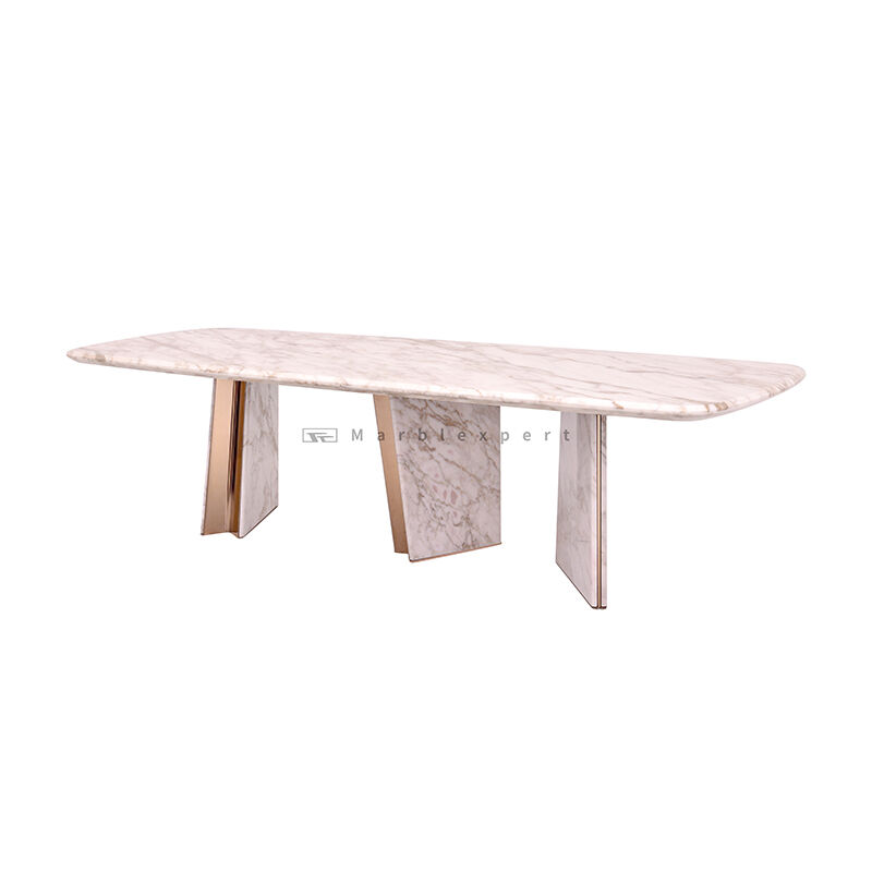 The heart of this dining table showcases natural marble in its most magnificent form, leveraging its dense structure and high hardness to create a surface that is both beautiful and incredibly durable. The good rigidity of the marble ensures the tabletop maintains its perfect plane, while the excellent compressive strength allows it to withstand decades of use without compromising its structural integrity. The remarkable wear resistance means the surface will maintain its luxurious appearance through years of family meals and entertaining, while the inherent decorative properties of the marble ensure each table is a unique work of natural art. The bevelled edge detailing is not merely decorative but functional, creating a refined profile that demonstrates the stone's excellent workability while adding an architectural element that frames the natural beauty of the marble. This combination of practical material advantages and sophisticated design details results in a dining table that is as functional as it is beautiful.