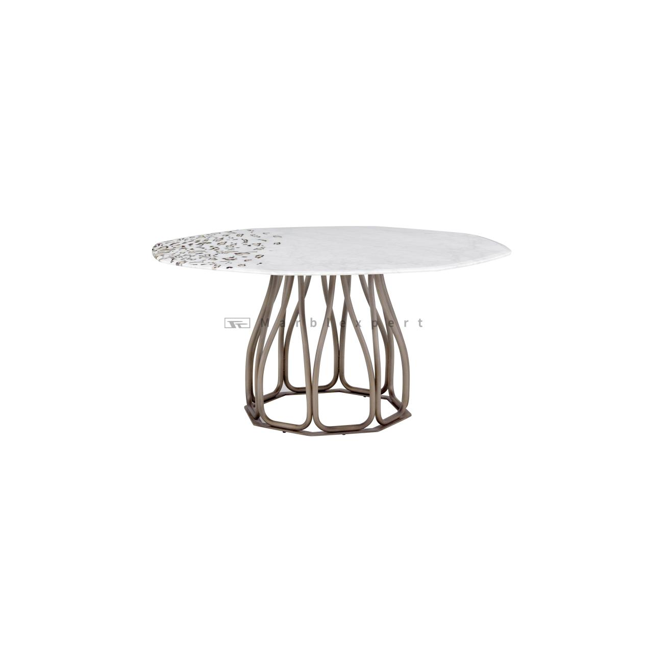 The tabletop and base are seamlessly and securely connected using a high-quality MDF (Medium-Density Fiberboard) core. This intelligent construction material is chosen for its exceptional stability and reliability, ensuring a perfect, durable union that prevents any movement or warping between the heavy stone and the metal base. Speaking of the base, it is nothing short of a sculptural marvel. Crafted from stainless steel with an irregular openwork design, the base is finished in a warm, brushed brass colour. This irregular openwork pattern creates a play of light and shadow, adding depth and an almost architectural lightness to the table's presence. The brushed brass-coloured finish provides a contemporary warmth that beautifully complements both the white Carrara and the distinctive leopard print marble inlays. This base does not merely support the table; it elevates it, making the overall design a singular statement of artistic courage and refined taste.