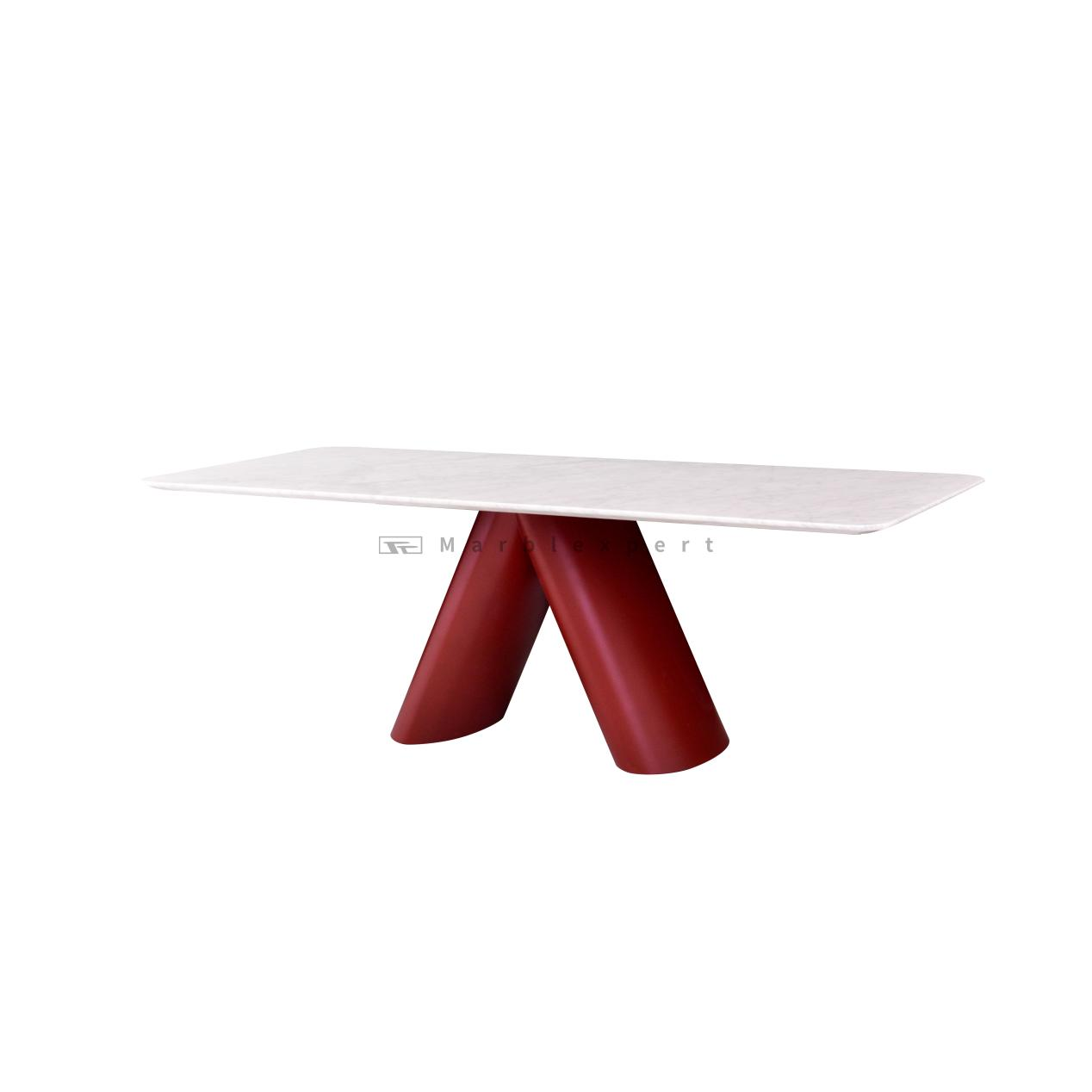 Exquisite Craftsmanship Evident in Every Detail and Curve: The quality of this dining table is palpable in its execution. The marble tabletop is finely honed to highlight its delicate texture, with edges finished to a smooth, precise profile that enhances its minimalist appeal. The burgundy legs are a testament to advanced manufacturing and finishing techniques; the smooth lines are flawless, and the color application is even and deep, likely achieved through a multi-stage lacquering process that ensures durability and a rich, lustrous finish. The seamless connection where the solid stone meets the sculpted legs showcases a high level of craftsmanship, ensuring that the table is not only beautiful but also built to last as a cherished heirloom piece.