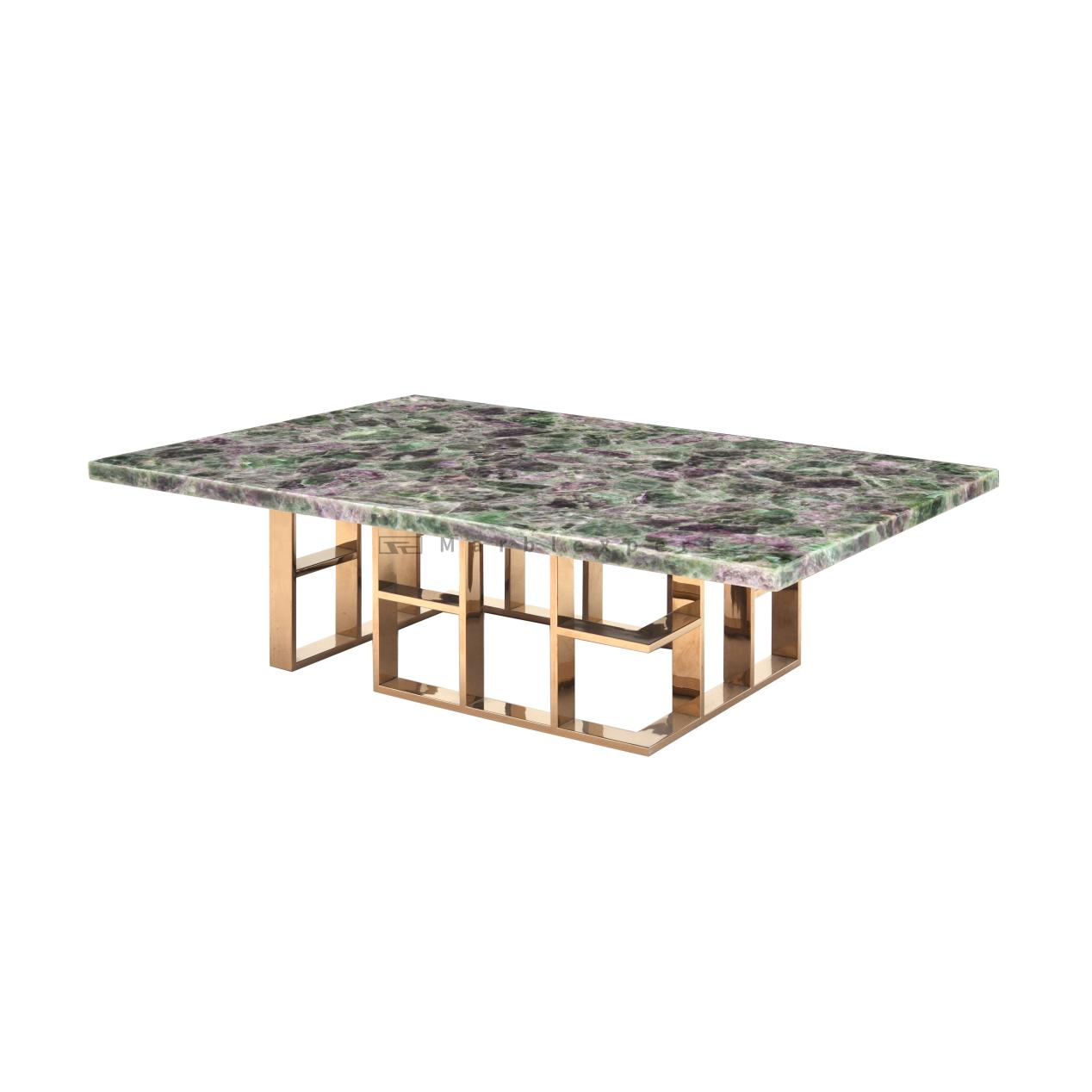 In the primary Living Room setting, this table acts as the undeniable focal point. Its generous surface is ideal for displaying art books, a curated collection of ceramics, or a striking floral arrangement. The reflective qualities of the mirrored gold stainless steel legs work to amplify ambient light, making the space feel brighter and more open. Positioned strategically within a seating arrangement, it creates a natural gathering spot, encouraging conversation and connection. Its unique blend of textures allows it to harmonize with a velvet sofa, a leather armchair, and a rustic jute rug all at once, tying diverse elements together into a cohesive and thoughtfully designed interior.