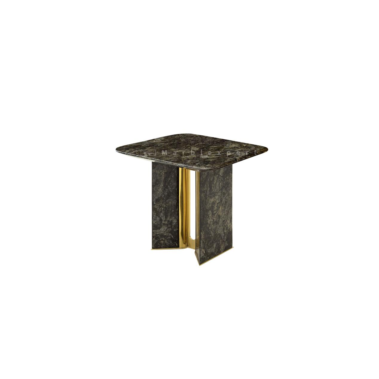 End table featuring a natural stone table top with beveled edges, wooden underside, and a polished base with champagne gold accents.